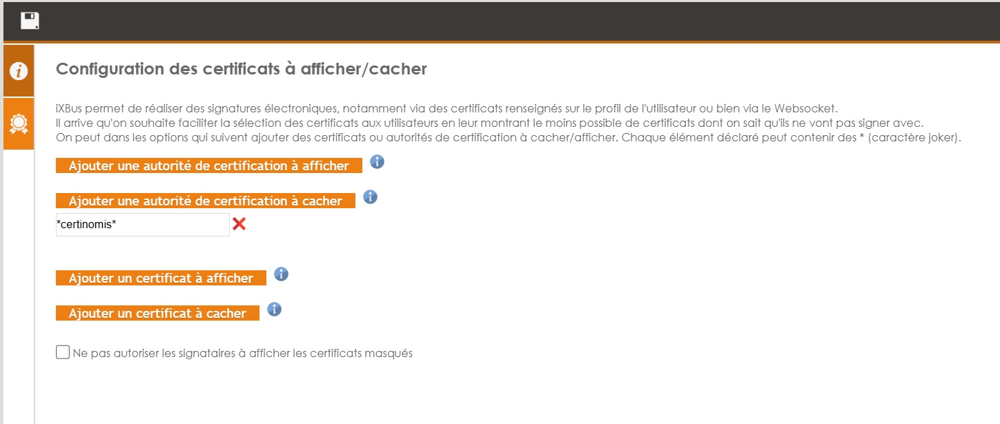 Ce menu permet d'afficher ou de masquer certains certificats aux signataires.