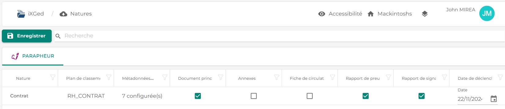 Dans l'onglet Parapheur, les natures iXParapheur sont automatiquement listées.