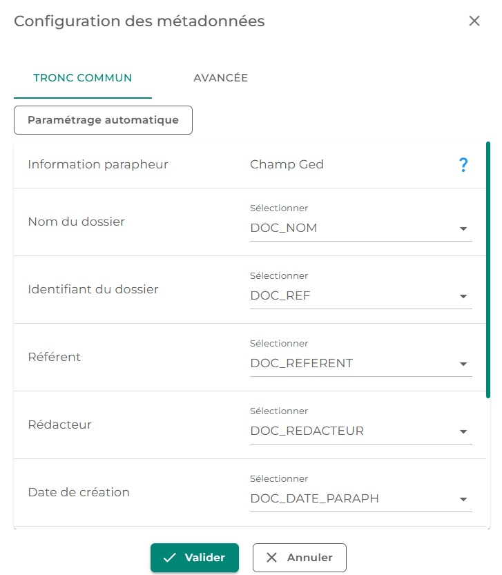 - Tronc commun : sont définies ici les métadonnées qui seront déposées en Ged quoiqu'il arrive. Il est possible d'effectuer l'association de manière automatique si les métadonnées Ged ont été crées suivant une convention de nommage prédéfinie.