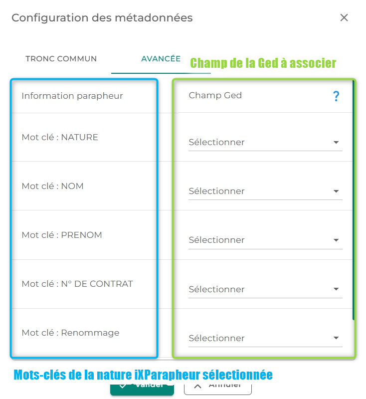 - Avancé : permet de faire une association fine entre un unique mot clé iXParapheur et une métadonnée Ged
