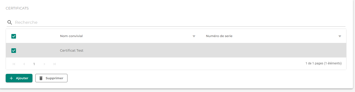 Vous pouvez en ajouter d'autres en effectuant la même opération ou en supprimer un en cochant la case correspondant au certificat à supprimer puis en cliquant sur le bouton Supprimer.