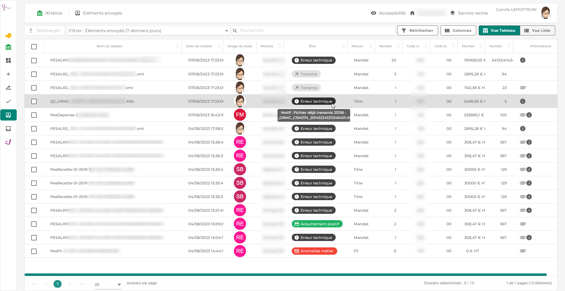 Cet écran présente l'ensemble des documents envoyés à la Trésorerie (Indigo, Hopayra, PESV2).