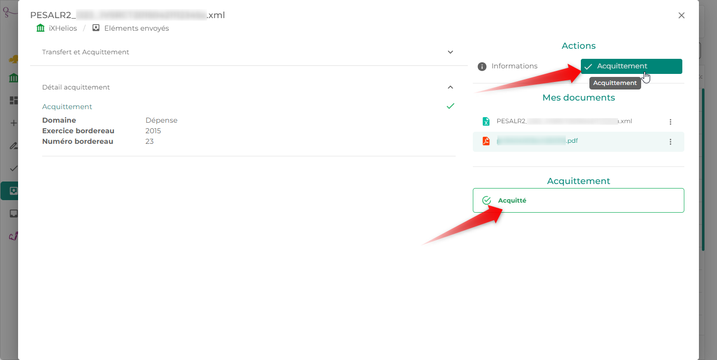 En plus des onglets précédemment présentés, un affichage supplémentaire est ajouté afin de reprendre les échanges avec la Trésorerie : l' Acquittement.