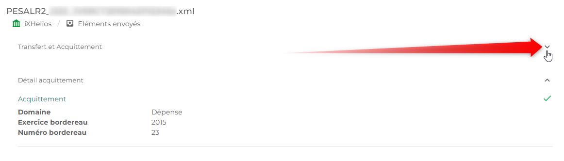 Vous pouvez déplier la zone « Transfert et Acquittement » afin de visualiser visualiser un aperçu de l'acquittement retourné par la Trésorerie.