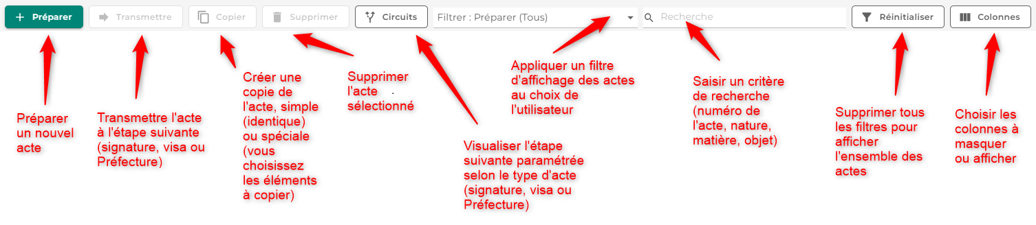 Le menu Préparer permet d'accéder à l'ensemble des formulaires créés et enregistrés par les utilisateurs de votre collectivité avant d'être transmis pour signature ou visa auprès de la Préfecture.