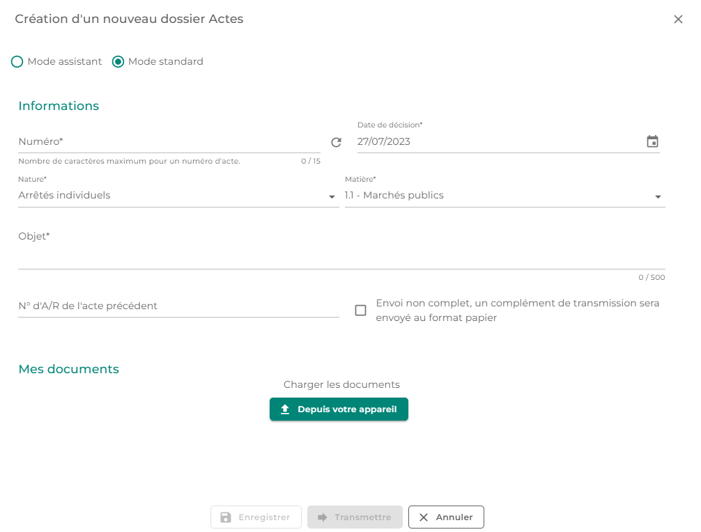 - Matière : Ce champ fait référence à la nomenclature utilisée par votre Préfecture.