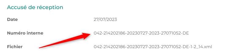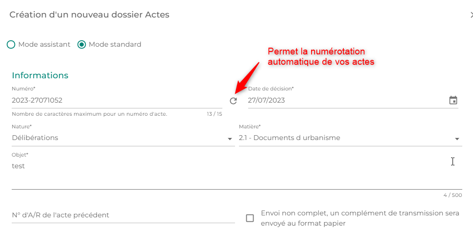 - N° d'AR de l'Acte précédent : Si le document fait référence à un ancien formulaire, vous pouvez préciser ici son numéro. Le numéro de l'acte précédent doit être composé de 15 caractères maximum. Il est récupérable dans la partie « Informations » de l'acte transmis à la rubrique Accusé de réception en tant que « numéro interne ».