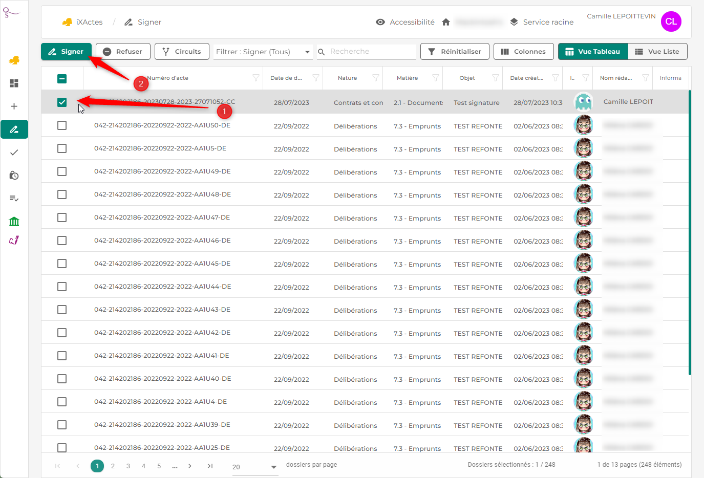 Pour signer un acte, cochez-le puis cliquez sur le bouton ou cliquez directement sur le