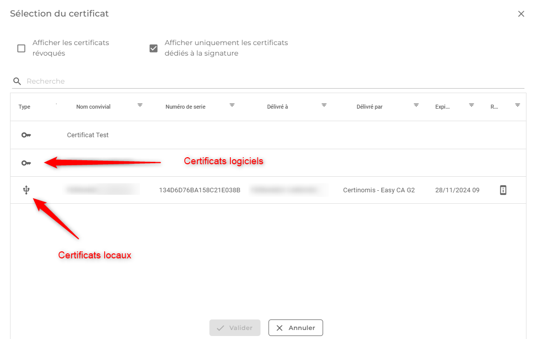 Vous pourrez alors filtrer ces certificats afin de n'afficher que ceux qui peuvent être utilisés en signature.