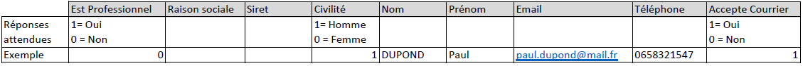 EstProfessionnel (1=Oui ou 0=Non);RaisonSociale;Siret;Civilite (1=Homme ou 0=Femme);Nom;Prenom;Email;Telephone;AccepteCourrier (1=Oui ou 0=Non)