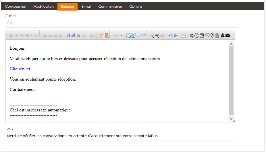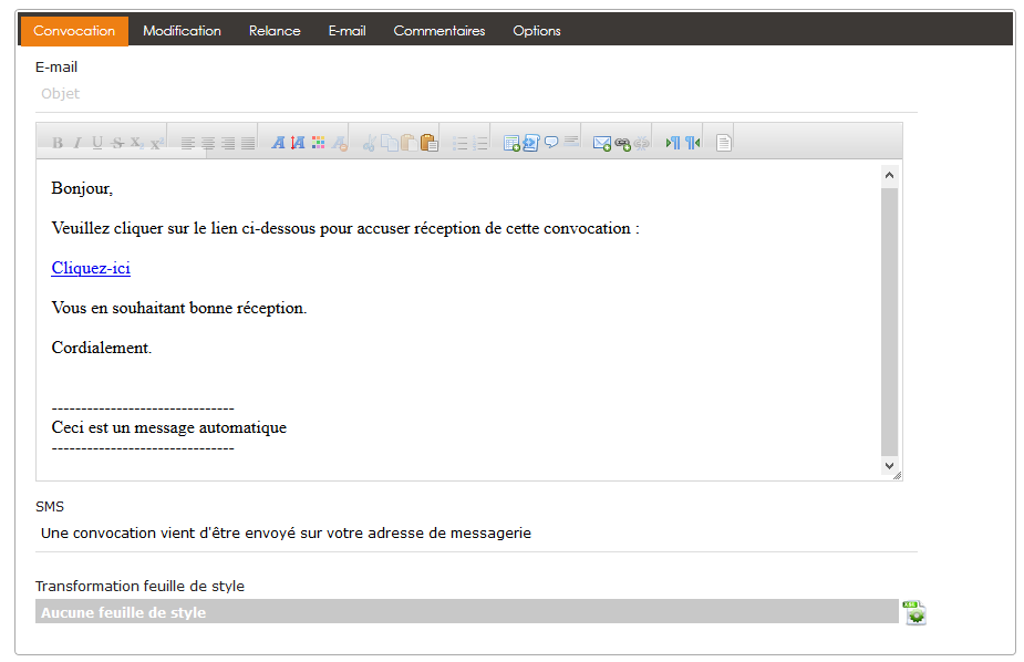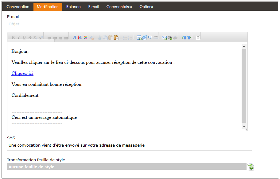 La première modification proposée est celle du contenu du message reçu lors de l'envoi d'une convocation.
