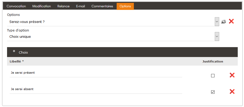 Par défaut, la question de la présence est paramétrée, ainsi qu'une demande de justification. Dans le cas présent, la justification n'est demandée qu'en cas de réponse « Je serai absent ».