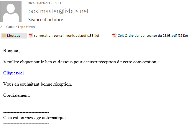 Sans paramétrage spécifique, le message sera conforme à l'exemple ci-dessous.