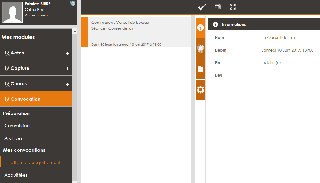 Une fois que l'utilisateur a accusé réception de la convocation, celle-ci se classe dans la rubrique « Acquittées ».