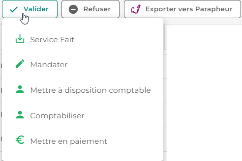 Permet de sélection un statut de validation De retourner la facture au fournisseur D'envoyer la facture dans iXParapheur pour service fait.