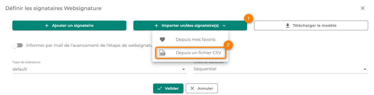 Avec le mode centralisé, il est possible d'importer dans le iXParapheur un fichier CSV qui contient toutes les métadonnées attendues. Depuis la fenêtre Définir les signataires Websignature, via le menu Importer un/des signataires (1) en utilisant l'option Depuis un fichier CSV (2).