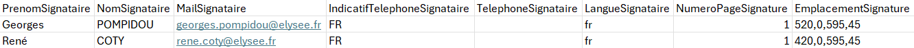 Exemple : NomSignataire1, NomSignataire2, PrenomSignataire1, PrenomSignataire2, MailSignataire1, MailSignataire2