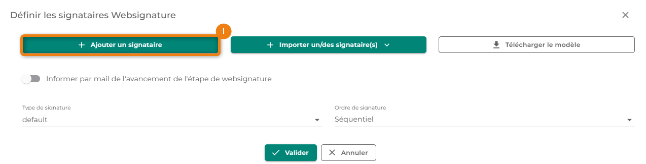 Dans ce mode de dépôt, cliquez sur Ajouter un signataire (1) afin d'ajouter les métadonnées nécessaires à l'identification du signataire.