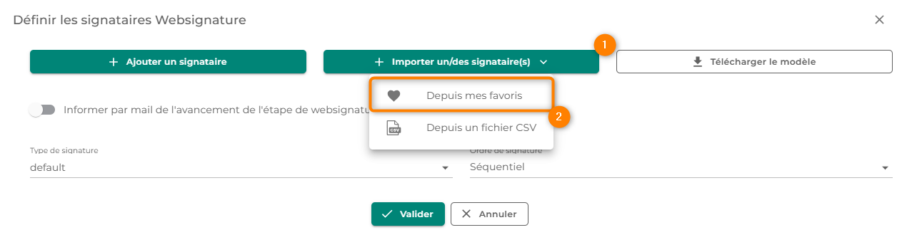 Les utilisateurs favoris sont disponible sur l'écran Définir les signataires Websignature via le menu Importer un/des signataires (1) en utilisant l'option Depuis mes favoris (2).